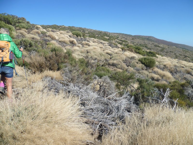 Aber: Der Beginn des Aufstieg ist ein relativ breiter, ausgewaschener Pfad und führt uns durch duftenden Kiefernwald aufwärts. Erst Geröll, dann ein mit Kiefernnadeln bedeckter Waldboden, eine Vielzahl der Teide-Skabiose-Büsche, der Rosalito salvaje, bevölkern die Landschaft, was muss das zur Blütezeit im Juni für eine Pracht sein.