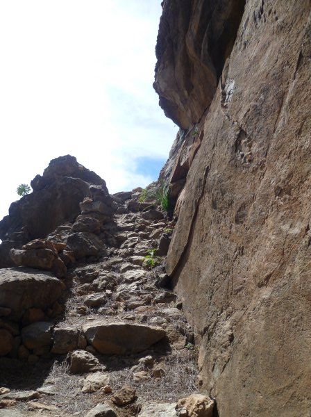 Lediglich bei einer Stelle unterhalb des Platzes der Eremita muss man aufpassen und sich rechts halten. – Kurz danach gelangt zum gut ausgebauten – mit Handlauf gesicherten – Abstieg und Aufstieg in den zugewachsenen Barranco.