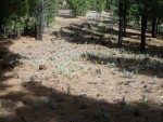 Die ganze Strecke geht zwischen lichtem Kiefernwald hindurch. Wir queren die gerade Anhöhe und bei einem Steinmännchen zwischen zwei schwarz verkohlten Kiefernstämmen führt der schmale Pfad, mit Kiefernnadeln bedeckt, vorbei an einer „Kinderstube“ von jungen Kiefernbäumen, abwärts.