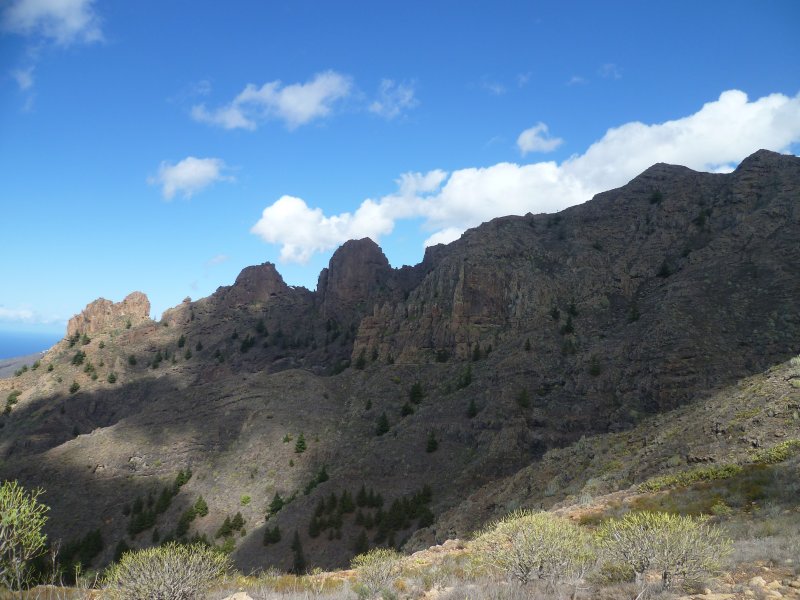 Die Ausblicke zur Küste mit ihren wie auf einer Perlenschnur aufgezogenen Orten, zur Insel La Gomera und auf die wuchtigen Massive von Roque Imoque und Roque de Los Brezos mit immer wieder anderen Felsformationen sind grandios.