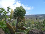 Der Pfad begeistert uns, Aeonien, blühender Kanarenknoblauch, Opuntien, dazwischen eine kanarische Kiefer, flechtenüberzogene Felsbrocken, blühende Tabaiba amarga und unendlich viele Stauden der Gänsedisteln, die bereits ihre prallgefüllten Knospen emporrecken, jedoch noch nicht eine einzige, vorwitzige Blüte.