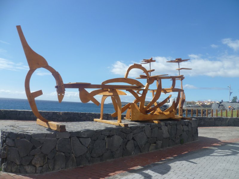 Wir gehen an einer ausgefallenen Skulptur und den vielen Restaurants vorbei abwärts Richtung Hafen, um dann nach dem letzten Restaurant „La Perla“ links hoch abzubiegen.