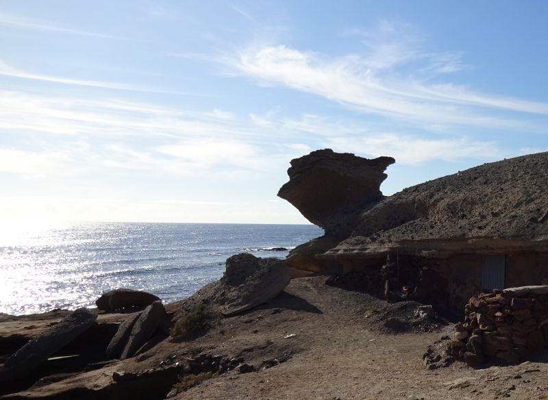 schaut man auf das von hier malerisch wirkende La Jaca. Wir gehen quasi unter einem Sendemasten durch, weiter bis zu einem Campingplatz. Entweder geht man über den Platz und folgt dem aufsteigenden, breiteren Weg oder man quert die sandige Badebucht und steigt steil auf den Bimssteinhang auf. Quert