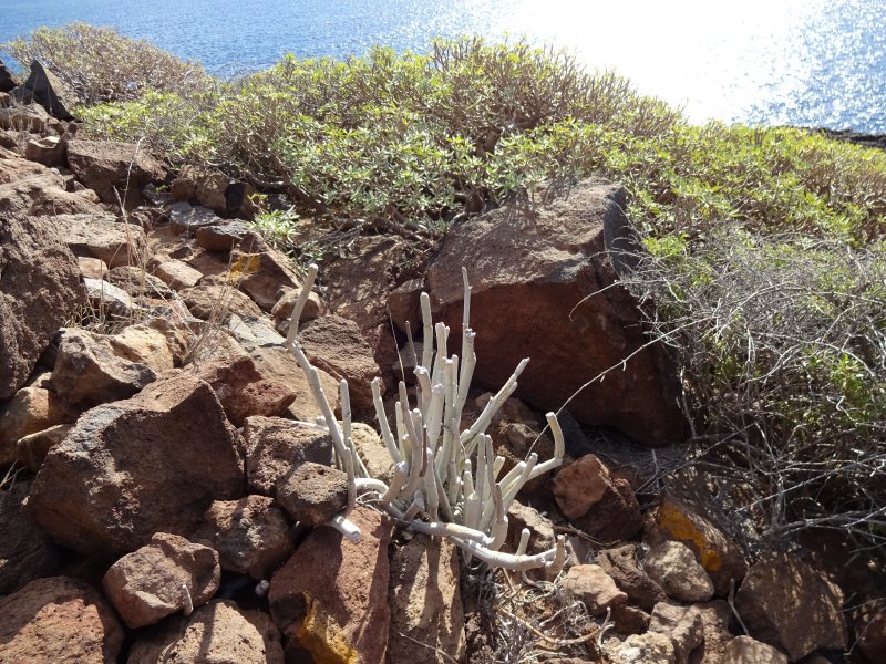 Dazwischen dann eine Holztreppe – nicht sehr vertrauenserweckend – die in eine Badebucht führt aber wir werden weiter hoch geführt. Vorbei an Tabaiba dulce, die hier das Bild beherrschen, aber auch Leuchterblumen säumen den Pfad und Musterexemplarer der Kandelaber-Wolfsmilch.