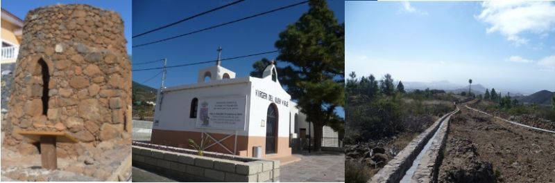 Der neu ausgewiesene und ausgebaute Wanderweg führt uns bis hoch oben auf die Fahrstraße auf zum Teil bekannten Pfaden (auch Asphalt). Vorbei an einem Ziegelbrennofen, der Kirche „Virgen del Buen Viaje“, zum Teil auf daneben neu ausgebauten Strecken hoch, hoch, die alte Wasserleitung rechts, die neue links,